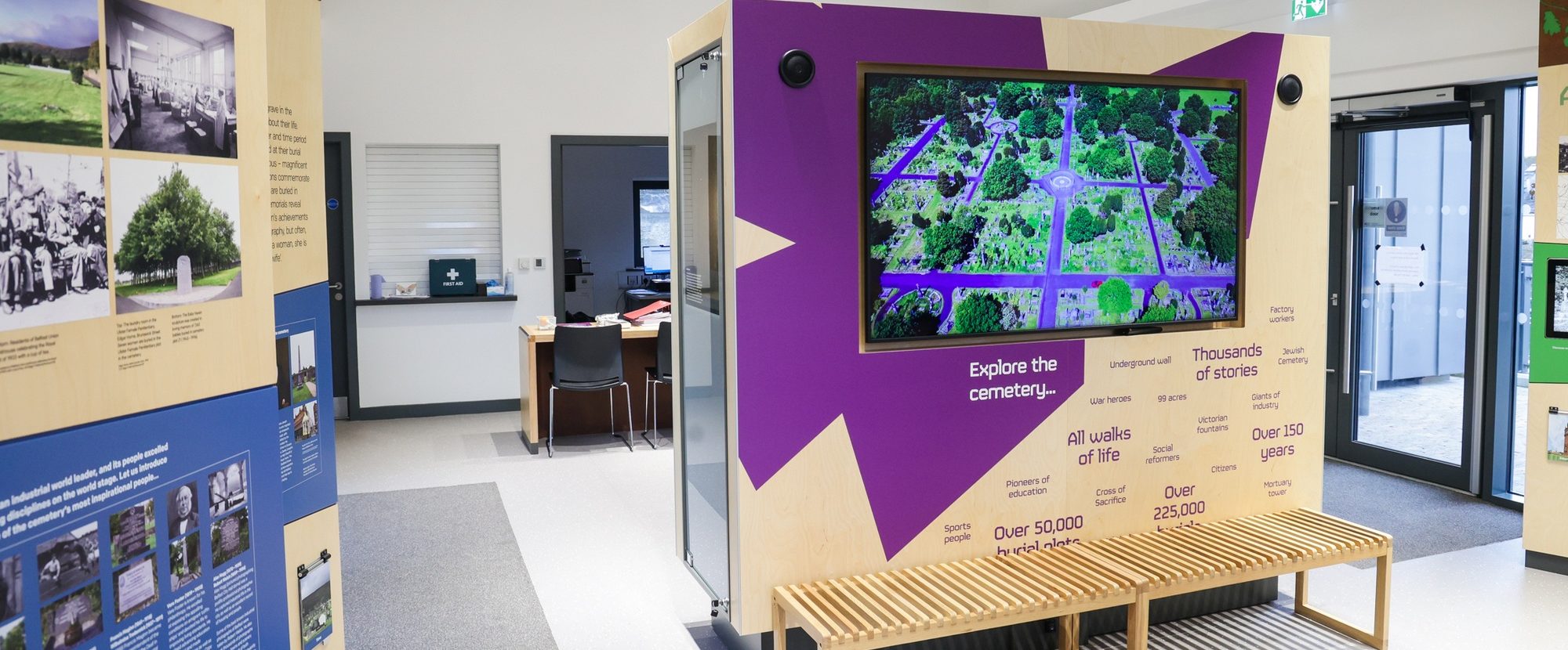There are a range of short video presentations from actors playing the parts of Victorian cemetery workers, industrial employees and video presentations on the two research terminals by specialist contributors: Bronagh Murray on Celtic Crosses, Tom Saunders on the War Graves, Belfast Jewish History with Steven Jaffe and Tom Hartley. The terminals also offer facilities for searching for grave locations showing an image of the headstone.